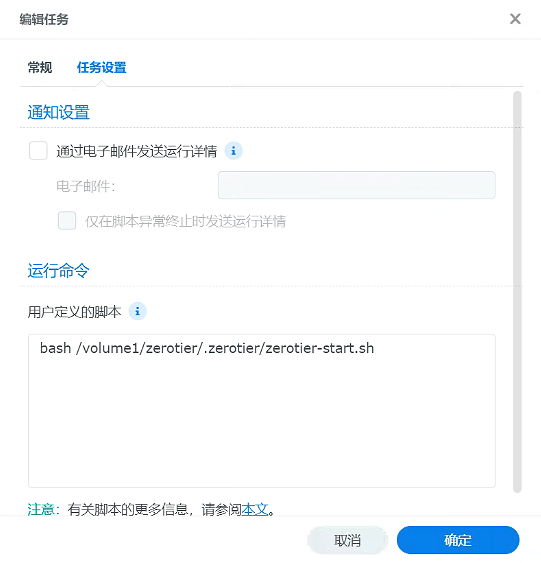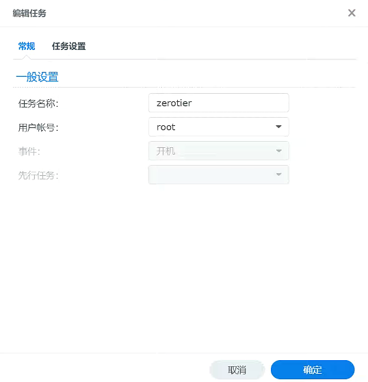 任务时间为 开机 用户账户为 root 下执行,任务名称可以任意。任务设置应包括 zerotier-start.sh 的完整路径